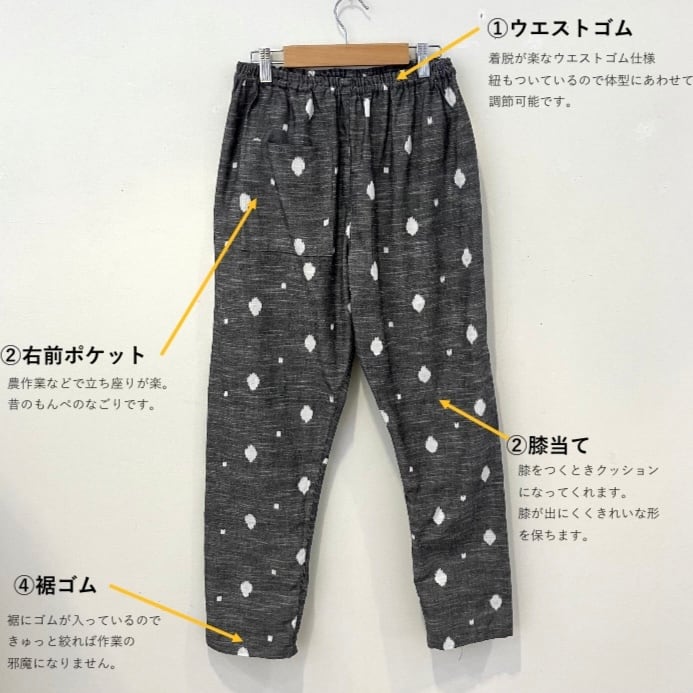 ウエストのゴム&ヒモや、前についたポケット、ゴム入りの裾、膝あてなどの嬉しい仕様は、MONPEと同じ作りなのでご安心くださいね